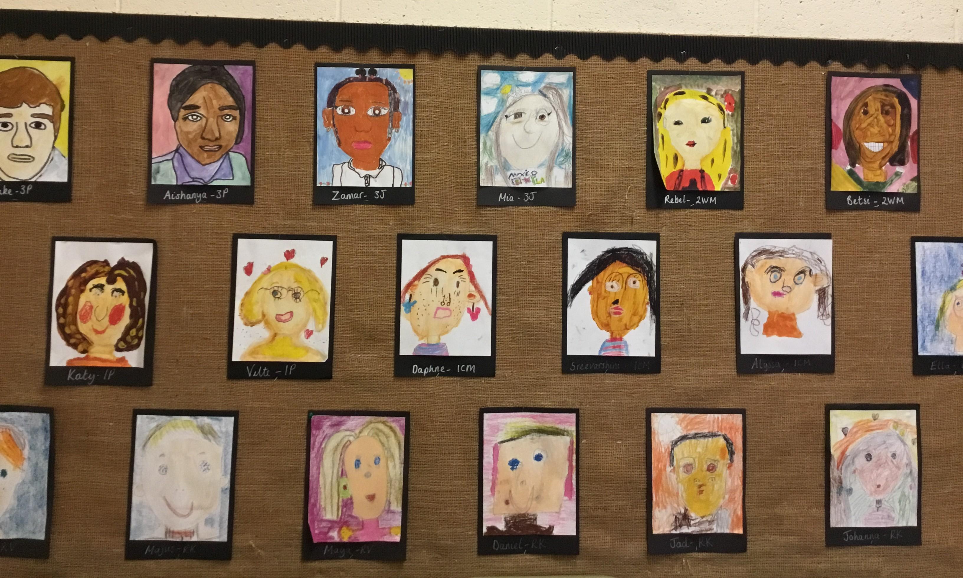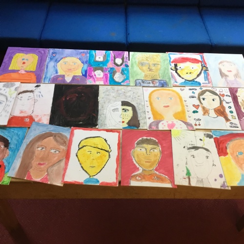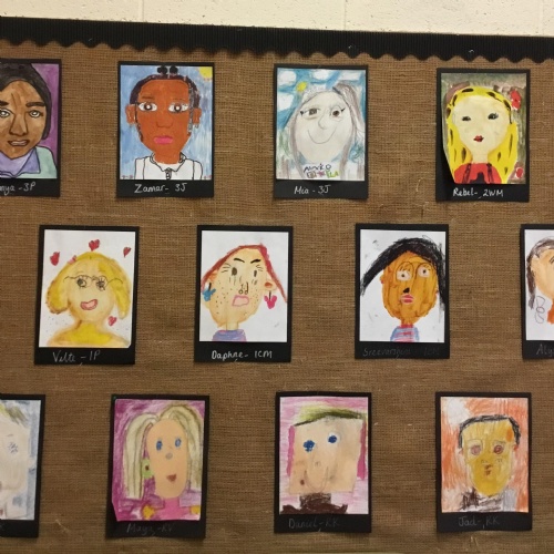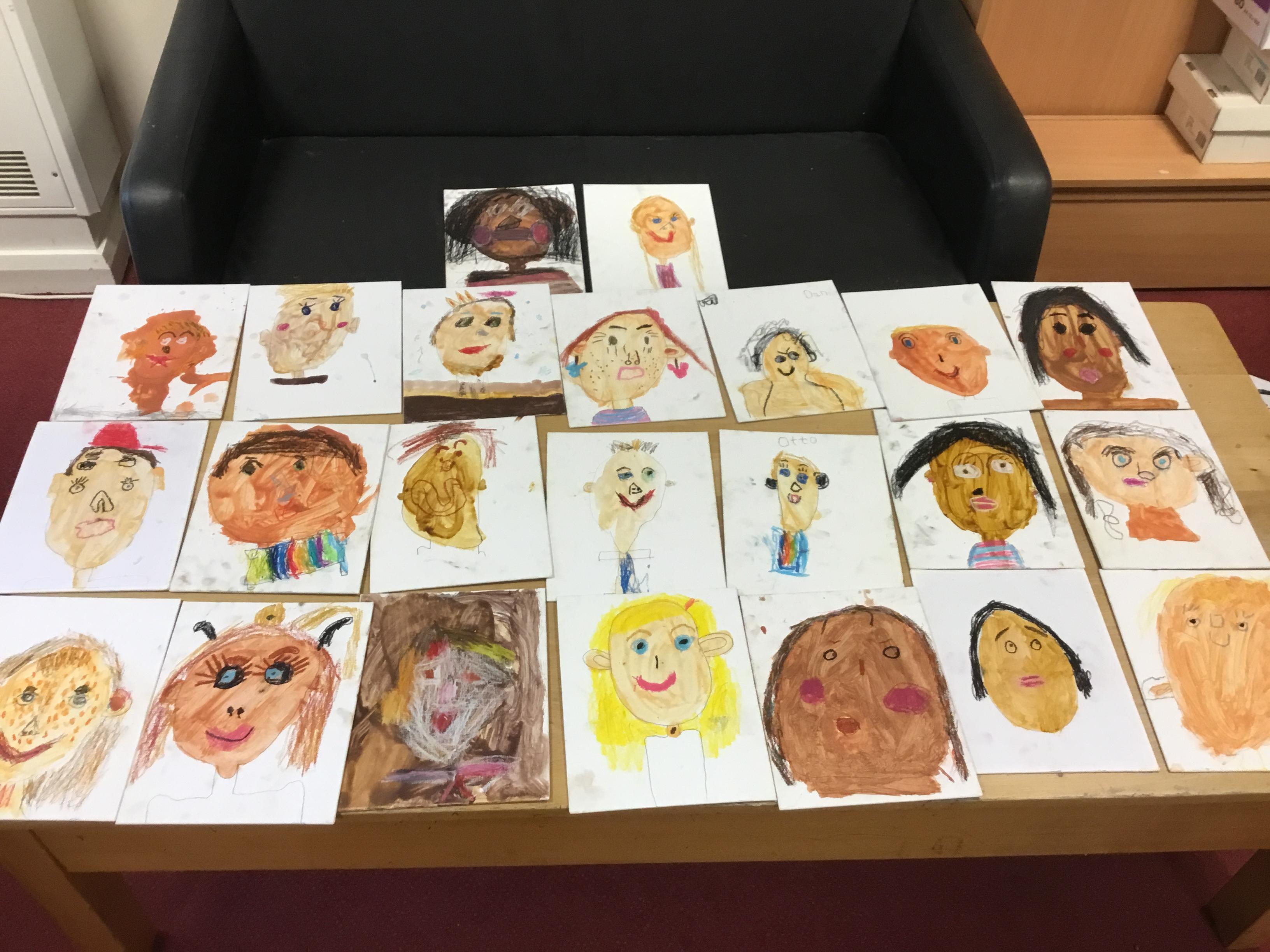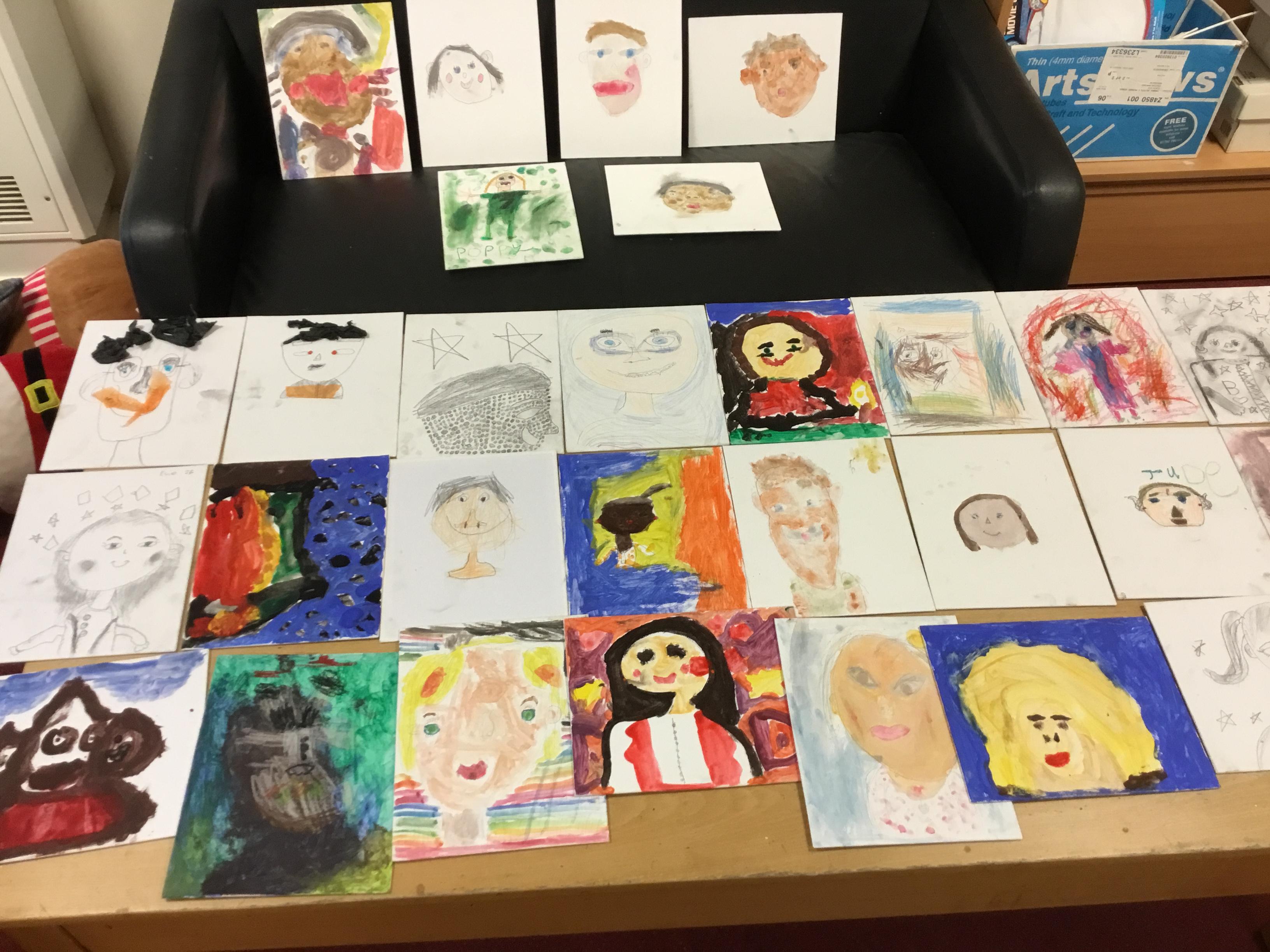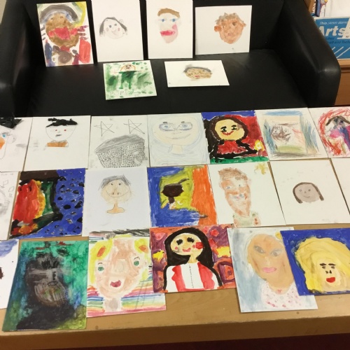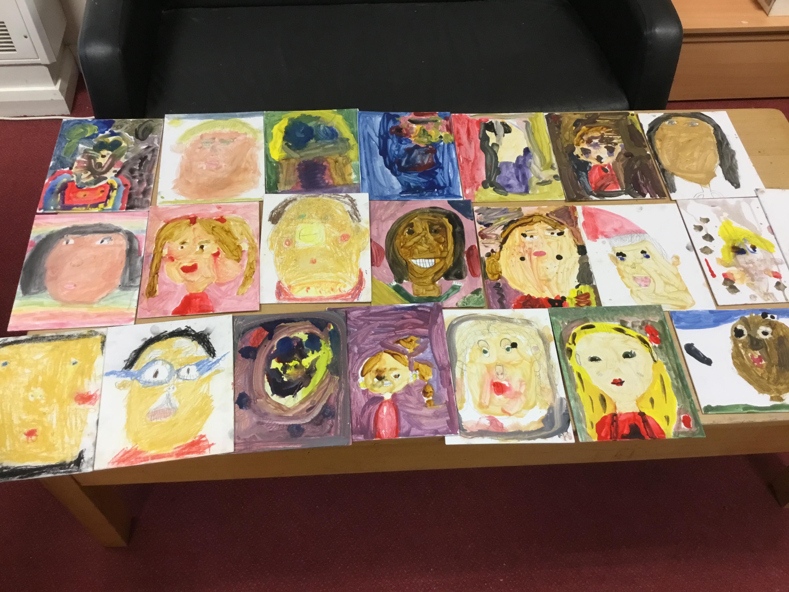 At the end of the week all of the self portraits were displayed gallery style. The children thoroughly enjoyed looking at all the portraits and it was wonderful to hear them critiquing the images.