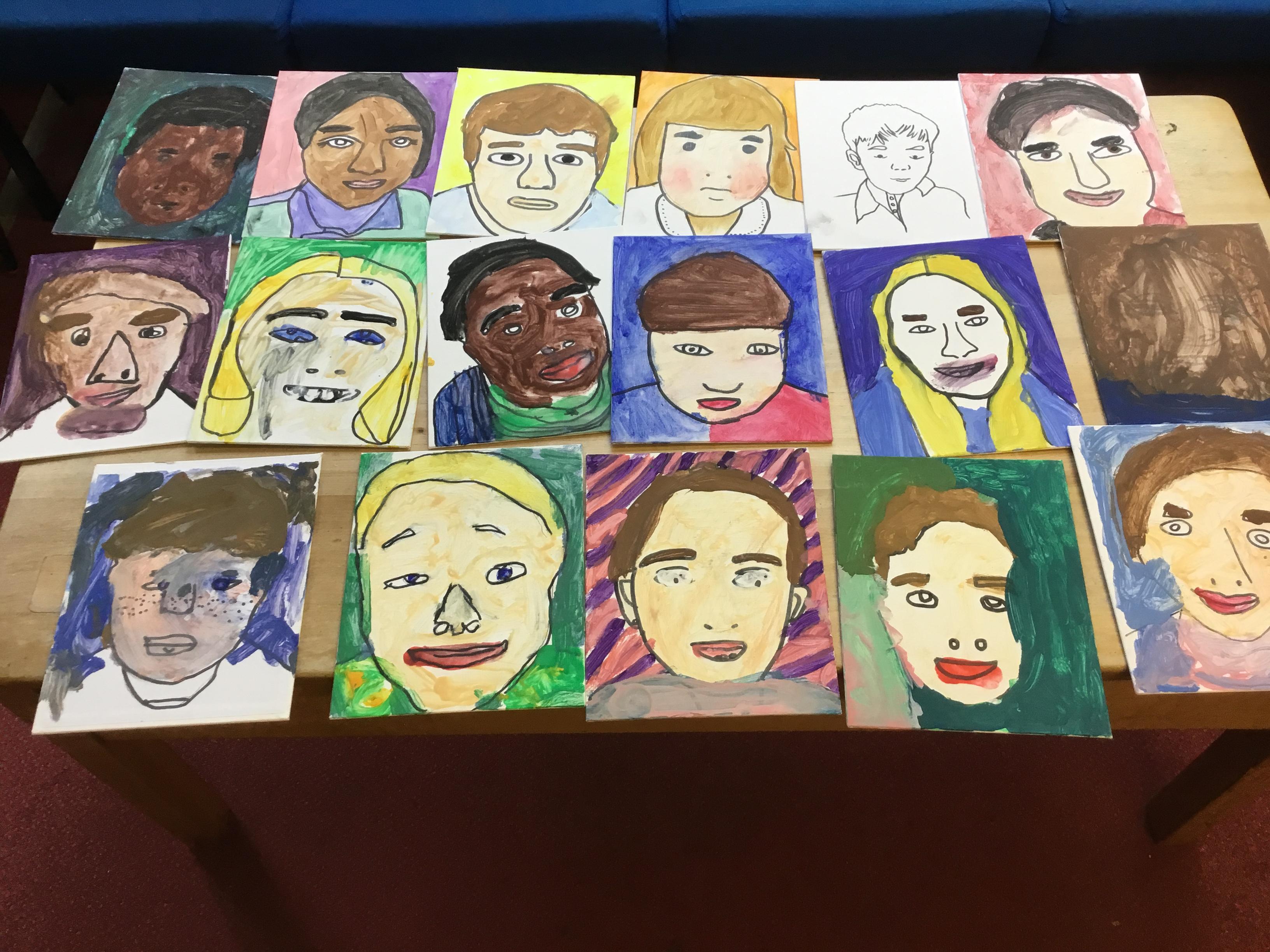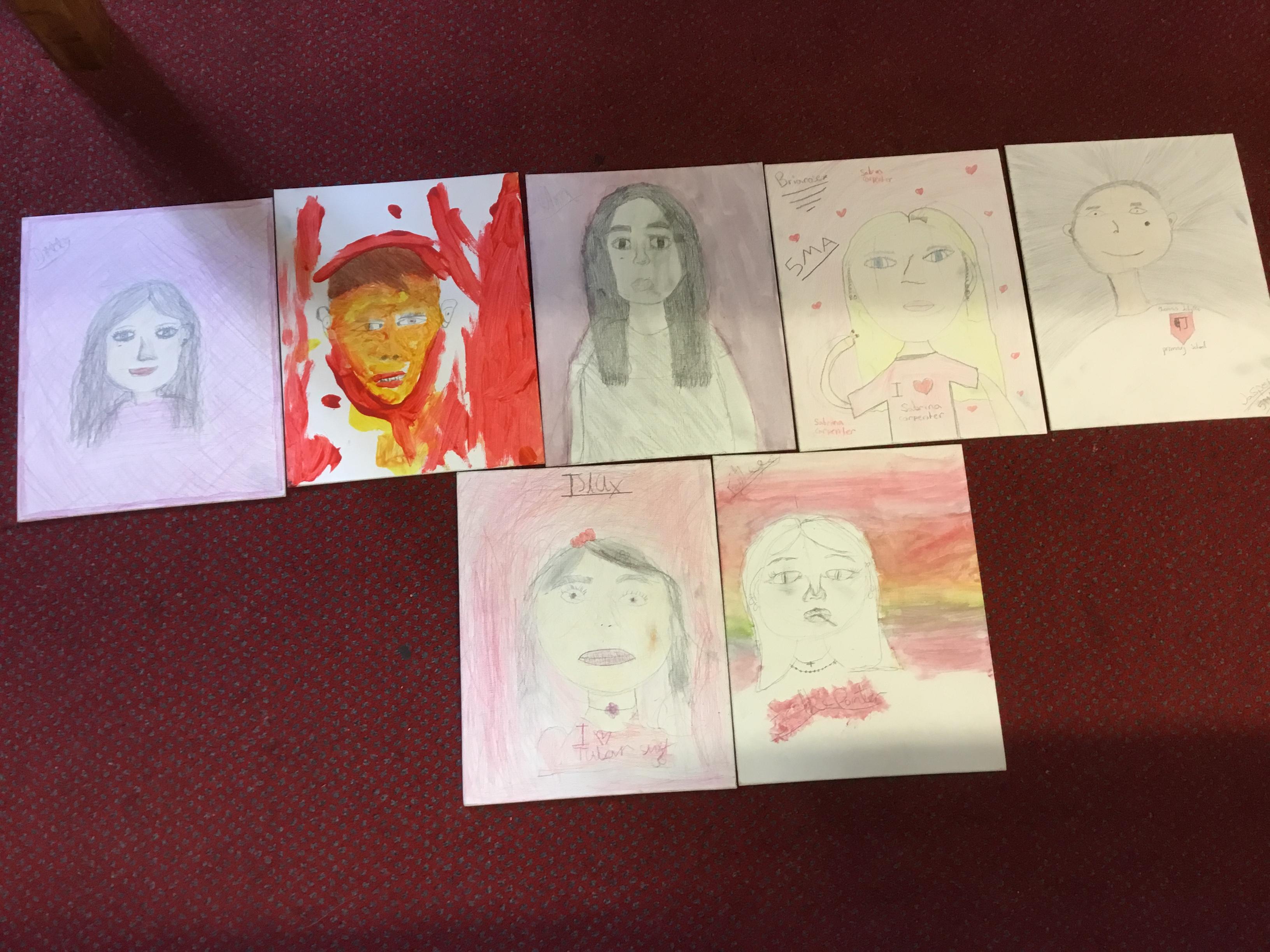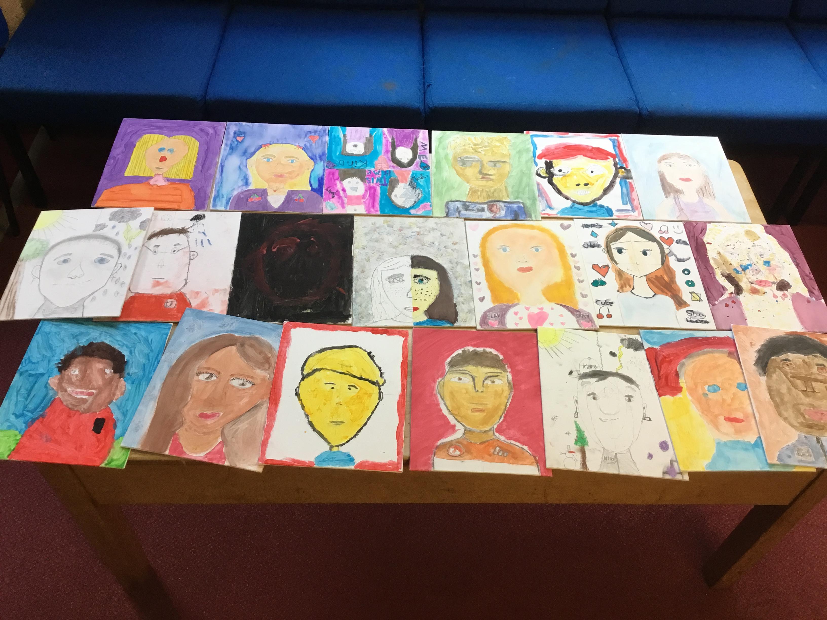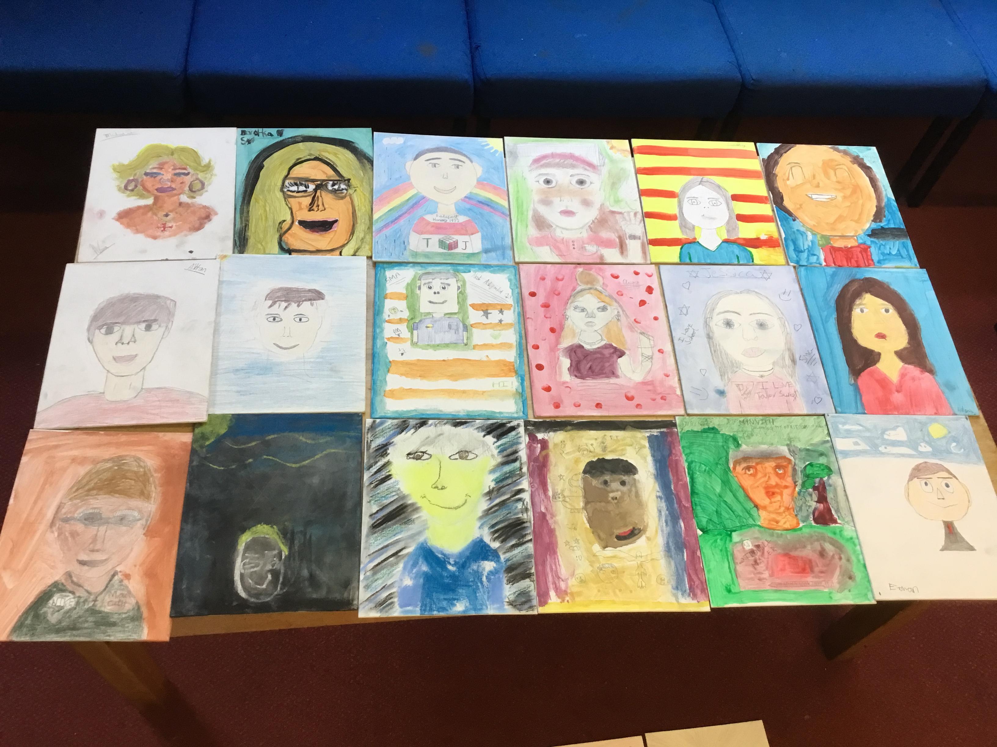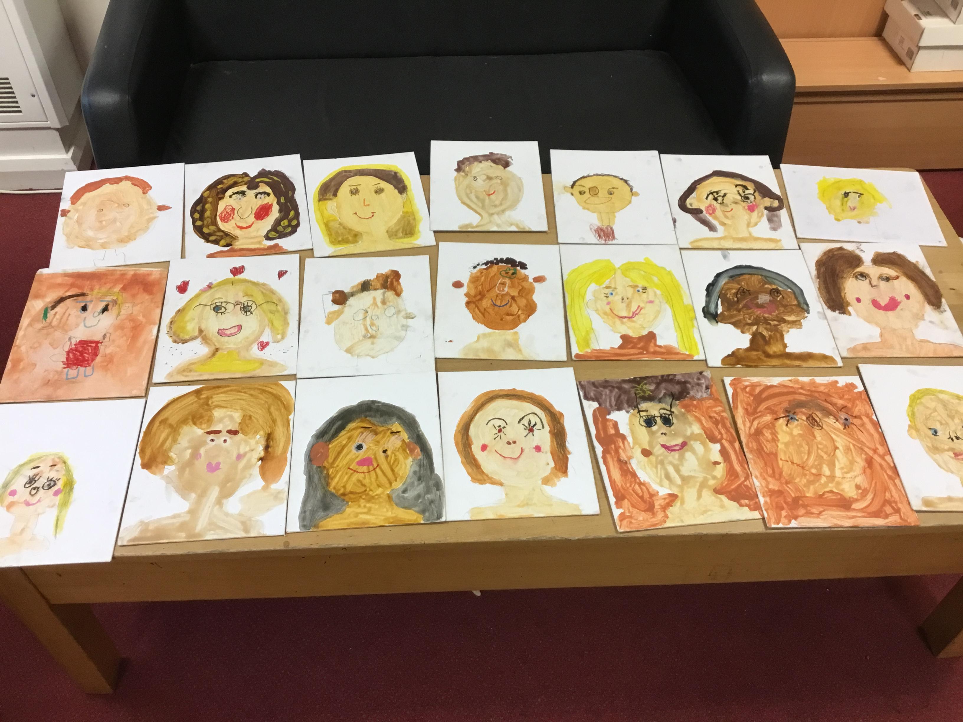 At the end of the week all of the self portraits were displayed gallery style. The children thoroughly enjoyed looking at all the portraits and it was wonderful to hear them critiquing the images.
