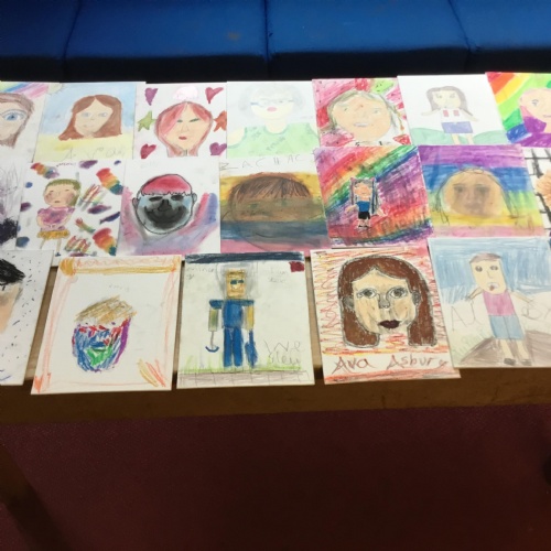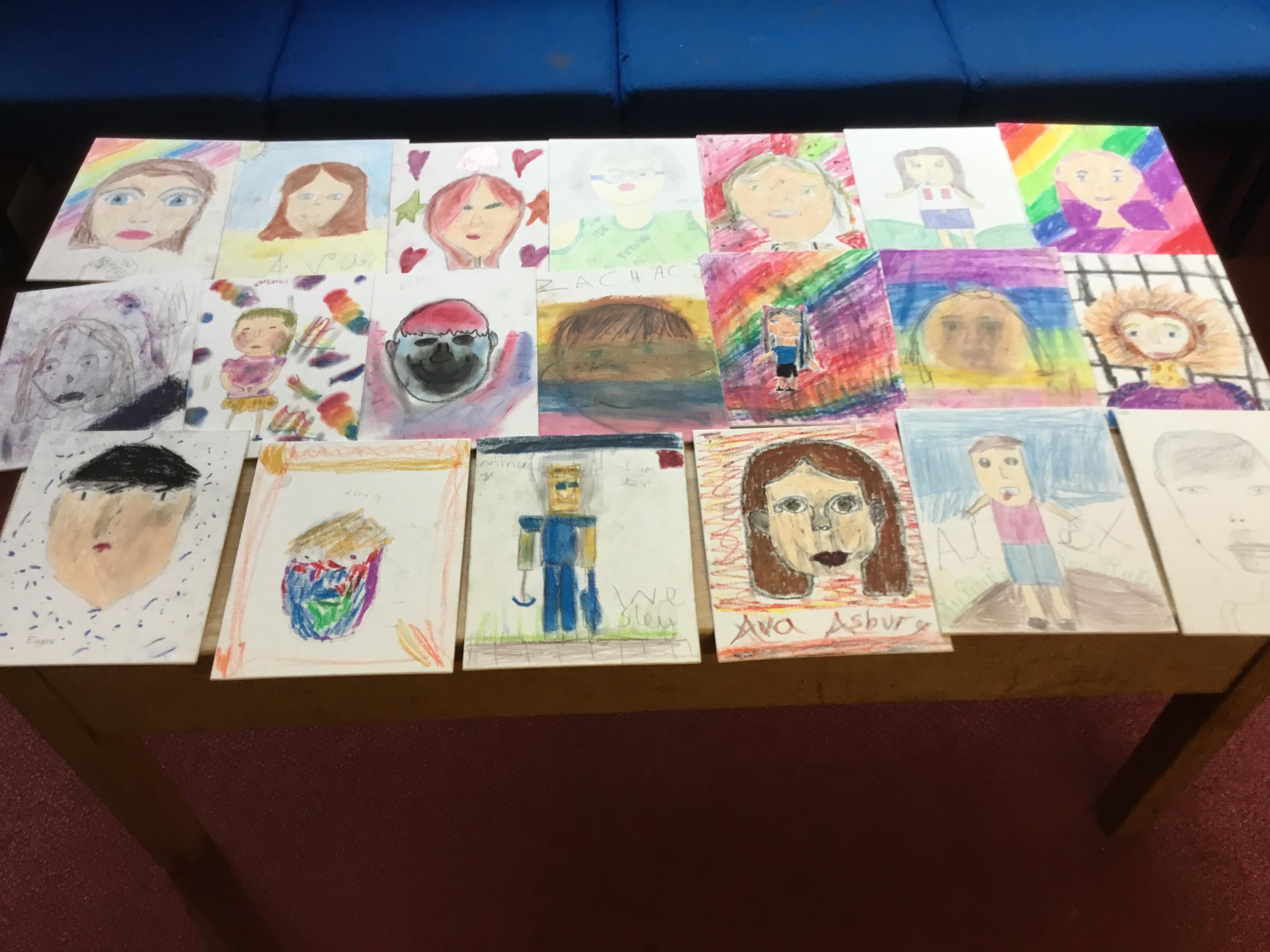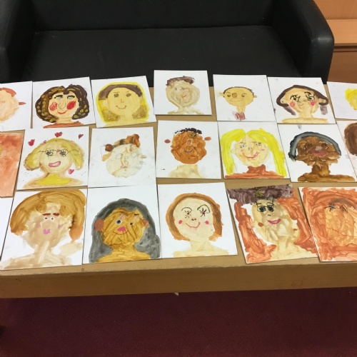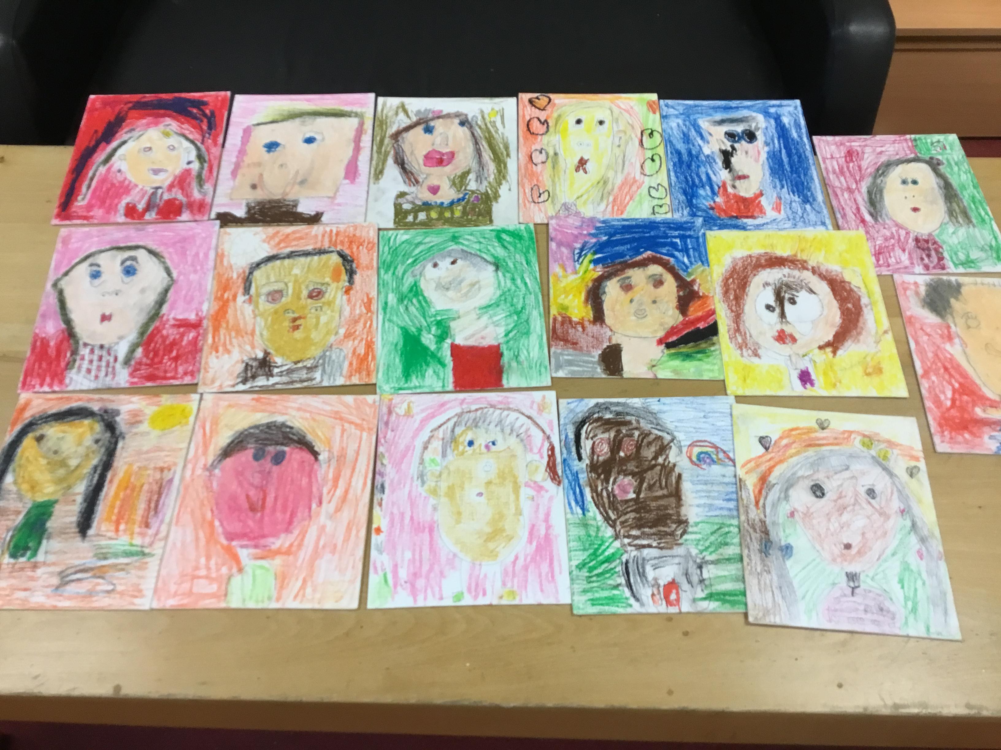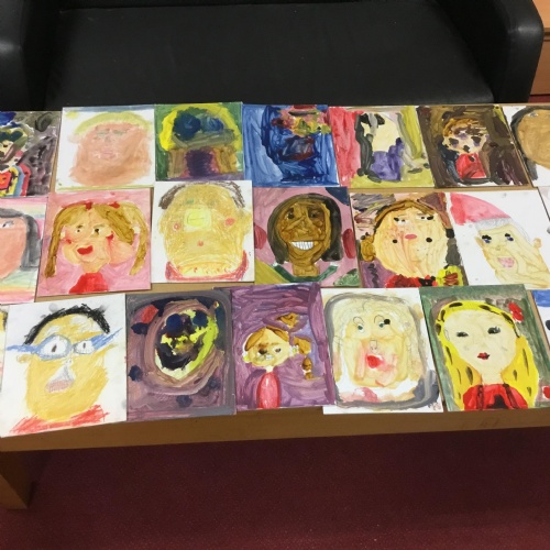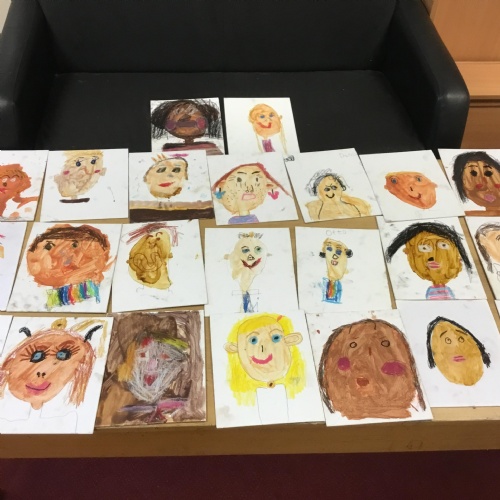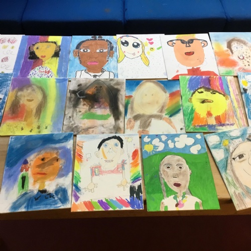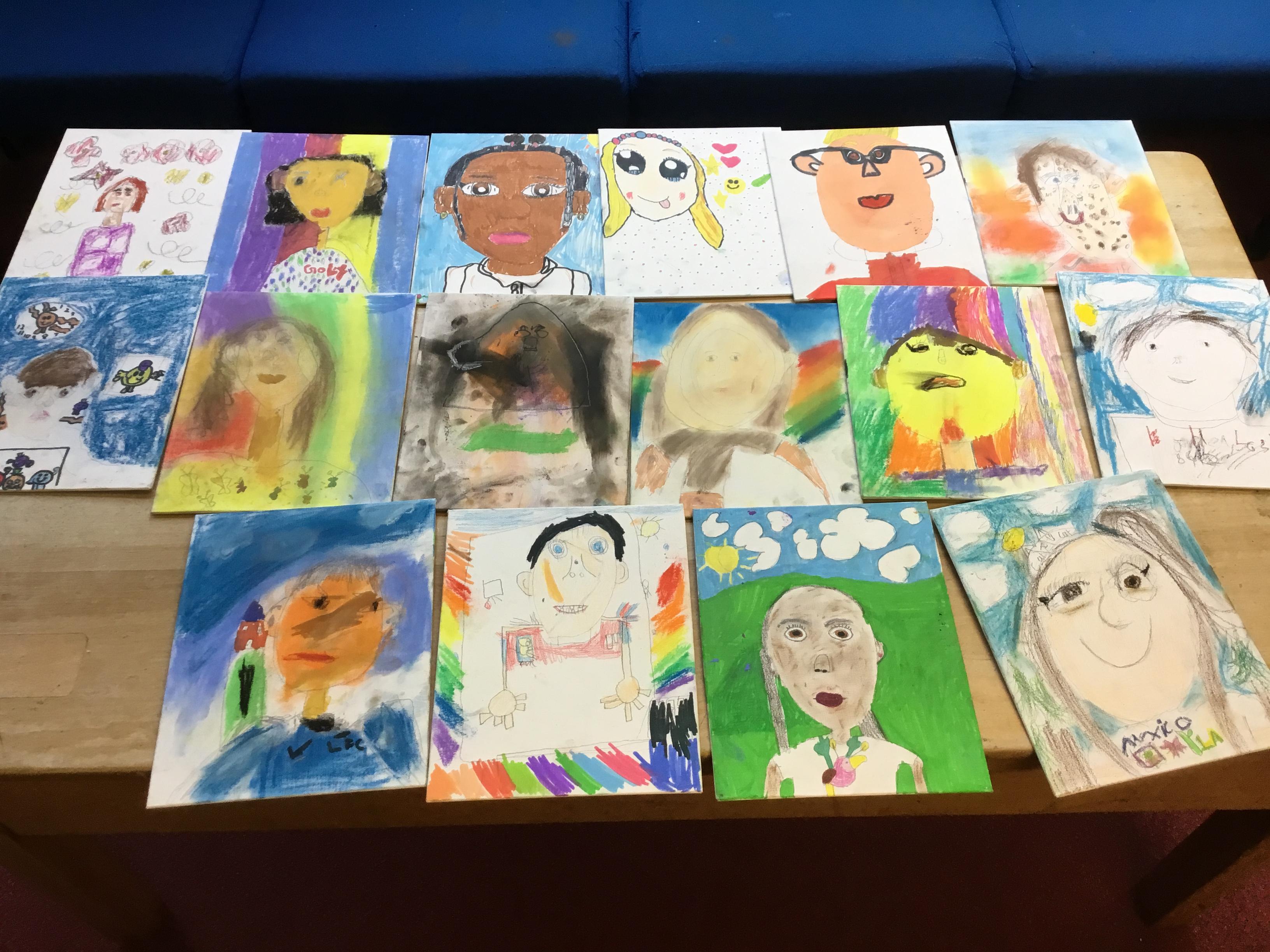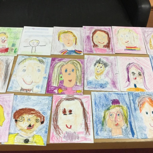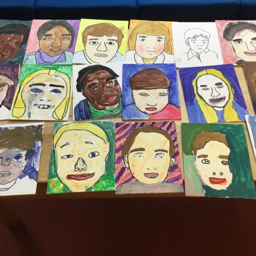 At the end of the week all of the self portraits were displayed gallery style. The children thoroughly enjoyed looking at all the portraits and it was wonderful to hear them critiquing the images.