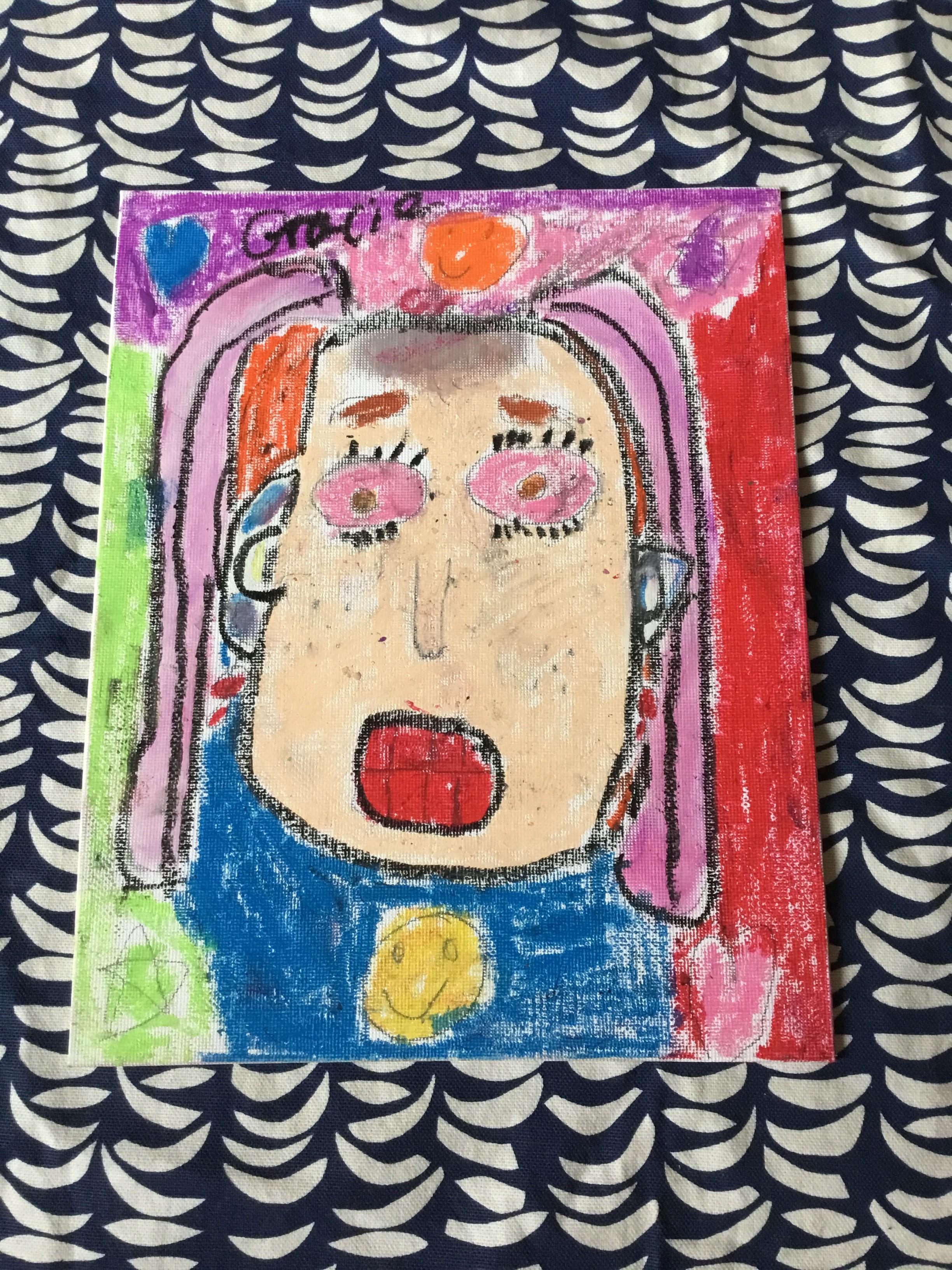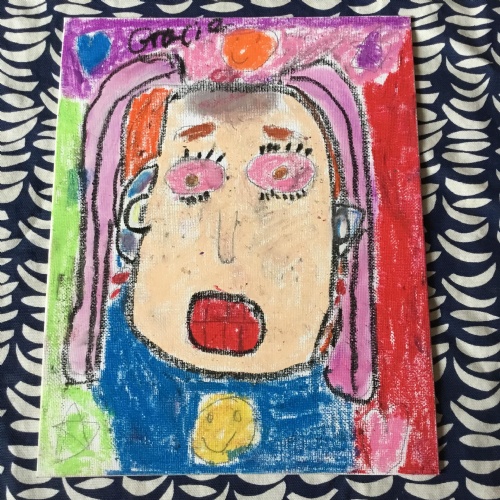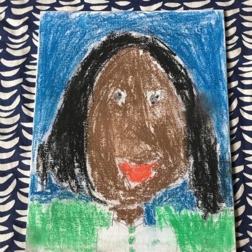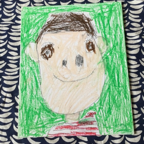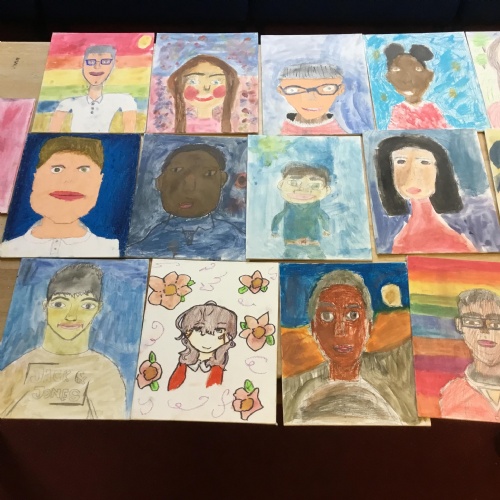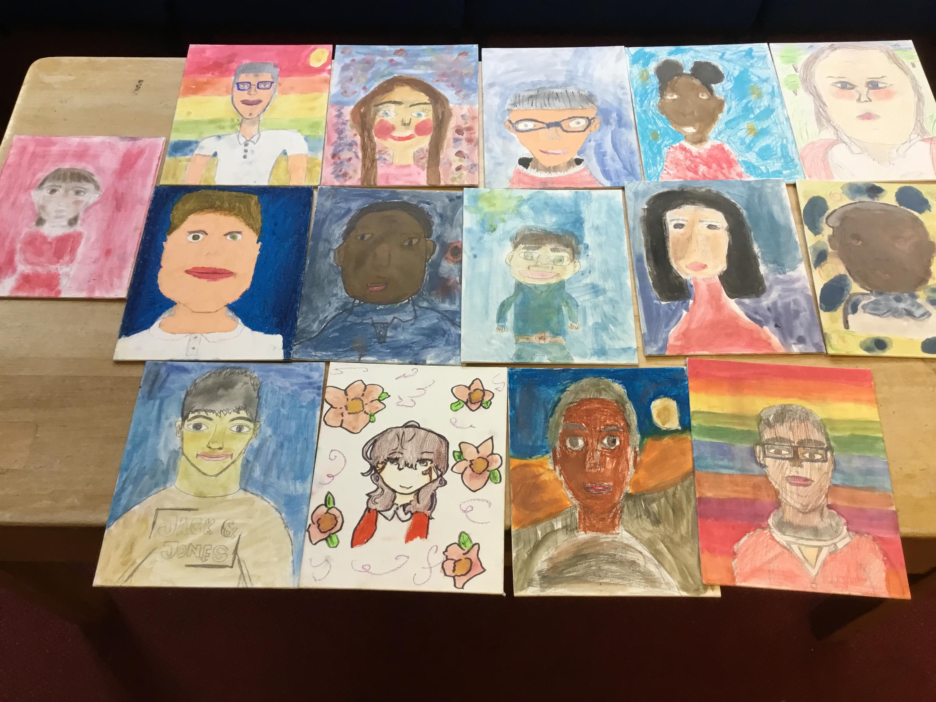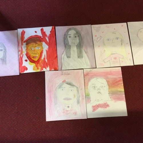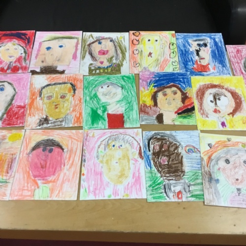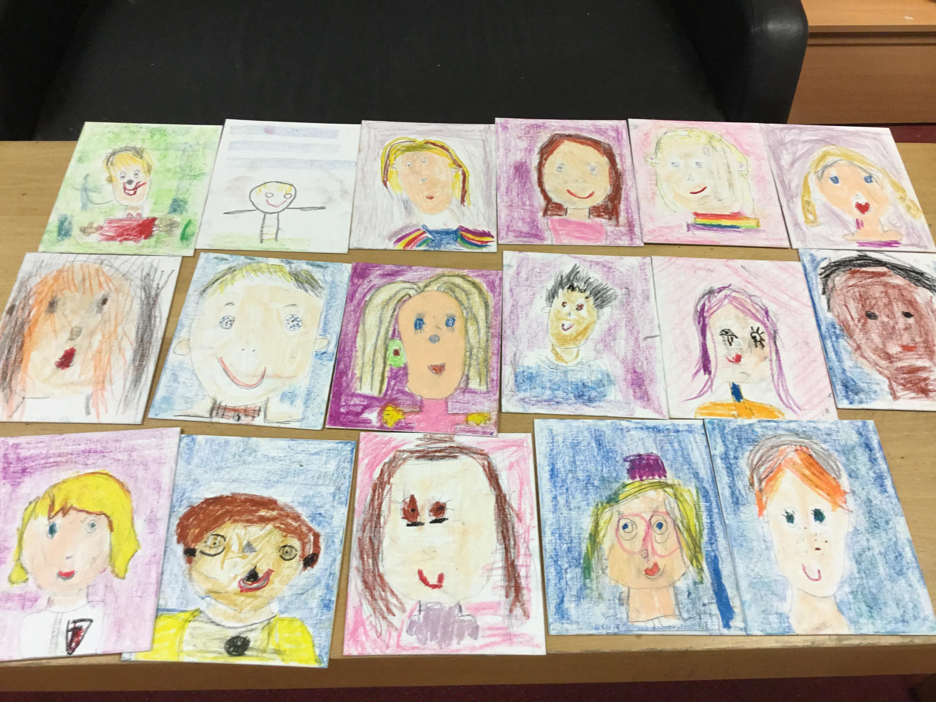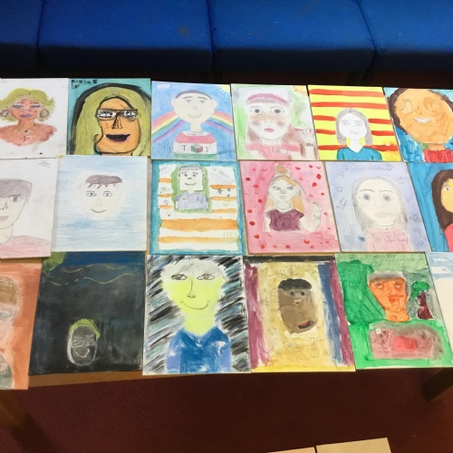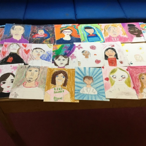 At the end of the week all of the self portraits were displayed gallery style. The children thoroughly enjoyed looking at all the portraits and it was wonderful to hear them critiquing the images.